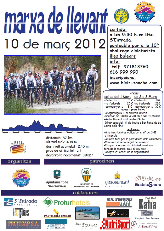 Entrega de dorsals a del 1 al 9 de Març a Bicicletes Sancho o dia 10 de 7:30 a 9:00 hores a c/ Joana Roca de Son Servera, Bar S’Entrada