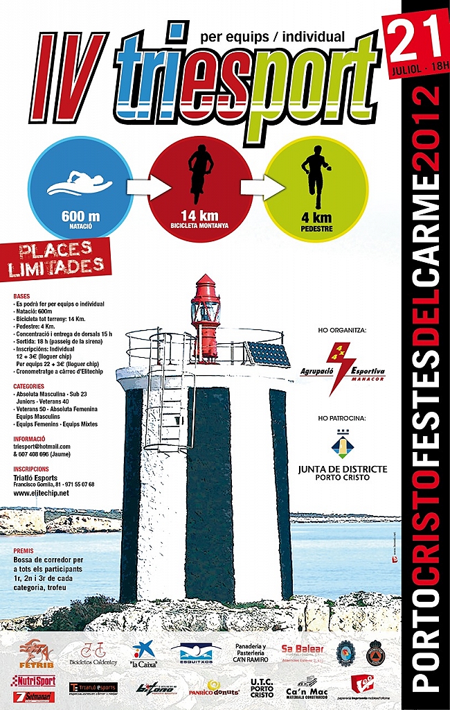 1-La AGRUPACIÓ ESPORTIVA MANACOR tiene previsto organizar el próximo día 21 de julio,a las 18:00 horas,el "III TRIESPORT PORTO CRISTO 2012", prueba que comprende las siguientes modalidades y distancias: