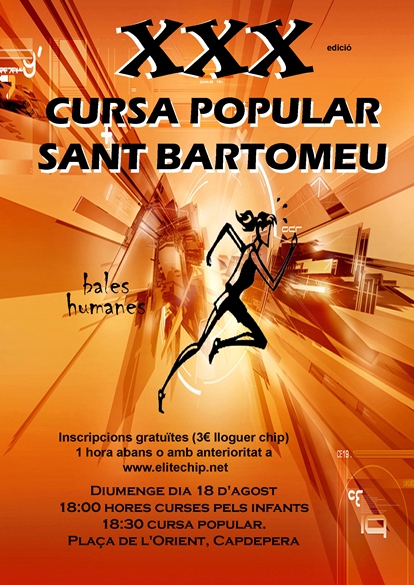 1.- LA XXX edició de la cursa popular de SANT BARTOMEU, es celebrarà a la plaça de l’Orient de Capdepera el diumenge 18 d’agost del 2013. A partir de les 18’00 hores amb curses per categories inferiors i a les 18’30 hores la cursa popular, sota l’organització del Servei Municipal d’Esports. El control tècnic de la prova estarà a càrrec del Comitè provincial de Jutges de la Federació d’Atletisme, amb l’obligació per part dels atletes d’acatar les seves ordres, així com aquelles que venguin de l’organització i dels agents de l’autoritat.