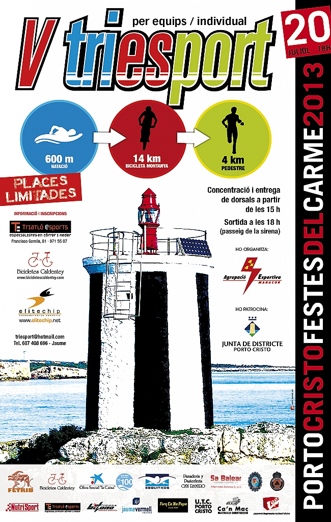 1-La AGRUPACIÓ ESPORTIVA MANACOR tiene previsto organizar el próximo día 20 de julio 2013,a las 18:00 horas,el "V TRIESPORT PORTO CRISTO 2013", prueba que comprende las siguientes modalidades y distancias: