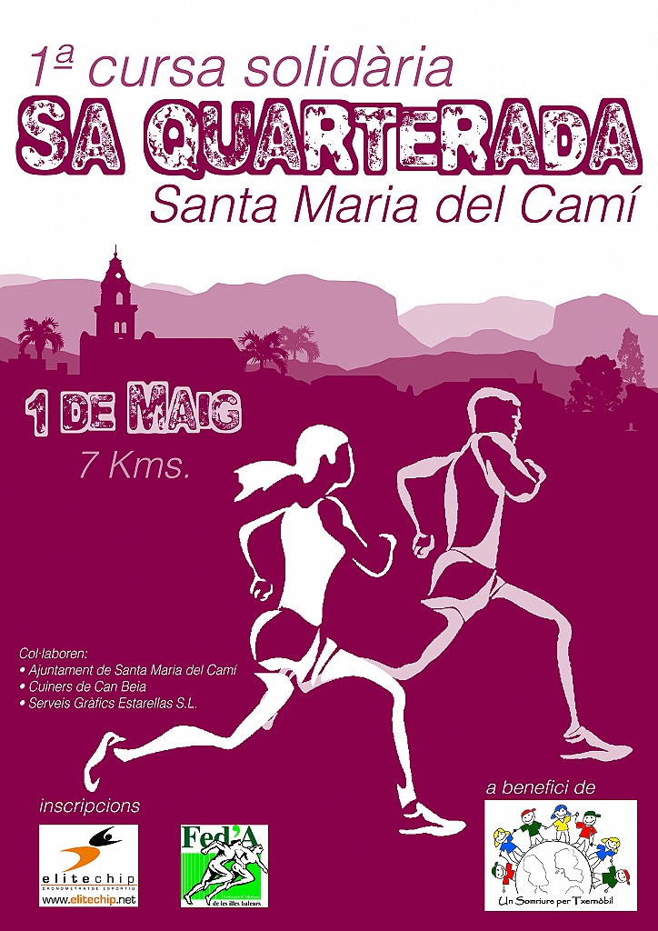 Data i hora: 01 de Maig a les 11:00 h Sortida i arribada: Plaça Nova de Santa Maria del Camí. Organitza: Ajuntament de Sta.Maria del Camí i l’Associació “UN SOMRIURE PER TXERNÒBIL” Col.laboren: Ajuntament de Sta.Maria,Club Atletisme Garden Hotels,Bar Can Beia,Serveis Gràfic Estarellas S.L,Cuiners de Can Beia,Garden Hotels.Bar Can Franco i Botiga Can Franco. Modalitats: Cursa infantil ,Cursa absoluta. Nordik Walkin, Recorregut i distáncies : 7.103 mts. El recorregut transcorrerà en un circuit urbà i interurbà,la sortida i l'arribada estaran situades a la plaça Nova del poble. La distància de la cursa será de 7.103m (tant per la cursa de nordic walking com per la cursa peu).El circuit estarà senyalitzat i no estarà completament tancat al trànsit, però estarà controlat per la Policia Local i la brigada de Protecció Civil. 10:00 h. INICI CURSA INFANTIL PER CATEGORIES.- INICIACIÓ MASCULÍ I FEMENÍ (nascuts 2007 i posteriors): 300 metres