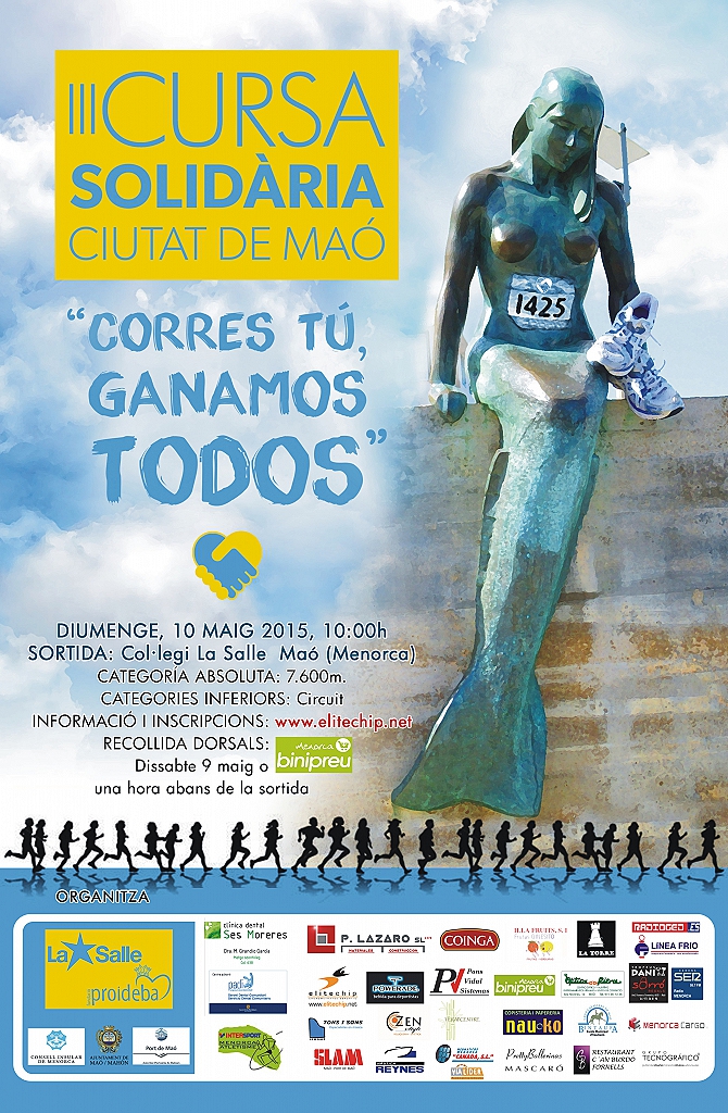 La III Cursa Solidària Ciutat de Maó Proideba - La Salle es celebrarà el diumenge dia 10 de maig de 2015 amb sortida i Meta al Col·legi La Salle amb un horari previst des de 10h a 12h.