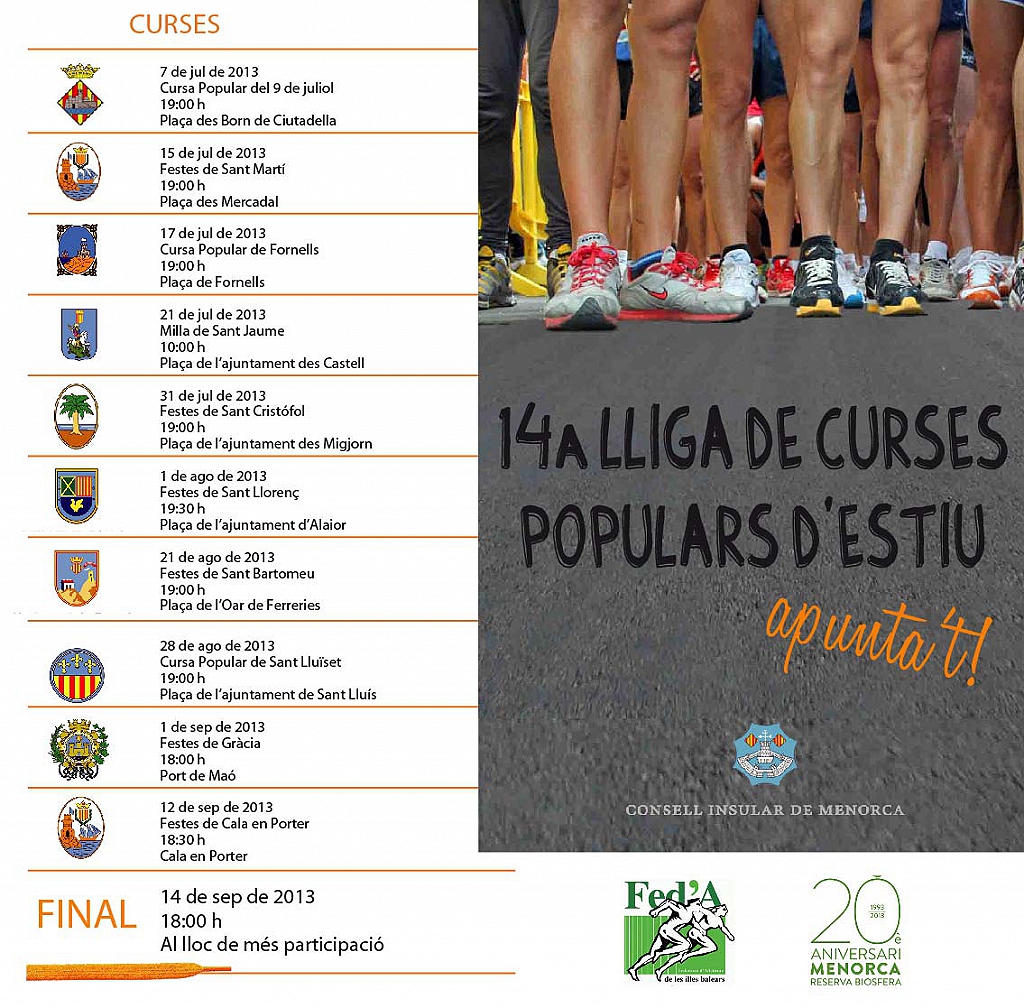 Les curses populars d'estiu a Menorca estaran emmarcades dins la XIV Lliga de Curses Populars Estiu 2013 - Gran Premi Consell Insular de Menorca, que consistirà en una lliga per puntuació.