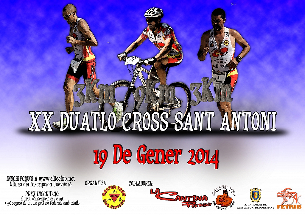 Las distancias del  XX Duatlon Cross Sant Antoni serán de 3km de carrera a pie, 9km en bicicleta de montaña y 3km carrera a pie.
