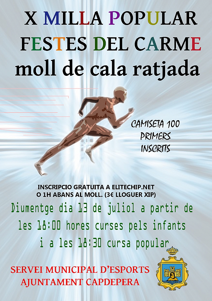 1.- LA MILLA POPULAR FESTES DEL CARME  es celebrarà al moll de Cala Ratjada diumenge dia 13 de juliol a partir de les 18,00 hores amb curses per nins i a les 18’30 hores la cursa principal, sota l’organització de la Comissió de Festes del Carme, Capdepera en Joc i el Servei Municipal d’Esports de l’Ajuntament de Capdepera. El control tècnic de la prova estarà a càrrec del Comitè provincial de Jutges de la Federació d’Atletisme, amb l’obligació per part dels atletes d’acatar les seves ordres, així com aquelles que venguin de l’organització i dels agents de l’autoritat.