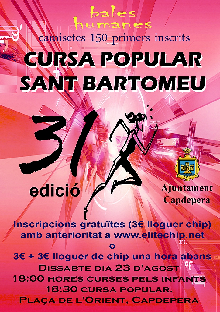 1.- LA XXXI edició de la cursa popular de SANT BARTOMEU, es celebrarà a la plaça de l’Orient de Capdepera el 23 d’agost del 2014. A partir de les 18’00 hores amb curses per categories inferiors i a les 18’30 hores la cursa popular, sota l’organització del Servei Municipal d’Esports. El control tècnic de la prova estarà a càrrec del Comitè provincial de Jutges de la Federació d’Atletisme, amb l’obligació per part dels atletes d’acatar les seves ordres, així com aquelles que venguin de l’organització i dels agents de l’autoritat.