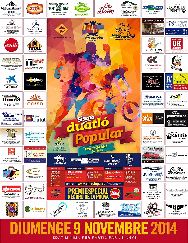 1. El dia 9 de novembre de 2014, a les 10:30 h es donarà la sortida de la VI Duatló Popular Fira de Sa Mel de Llubí. La prova es oberta a