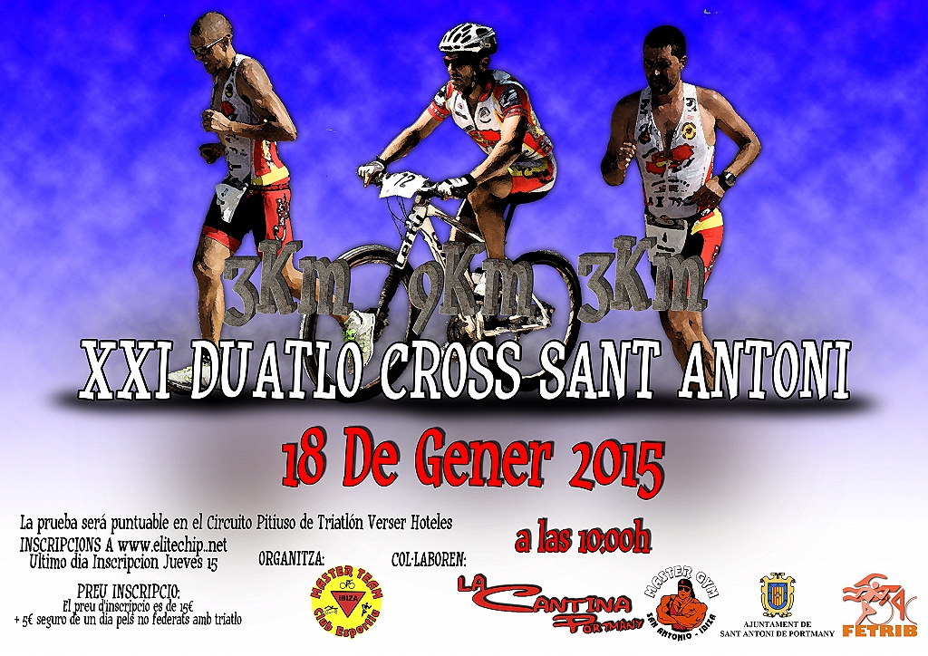 Las distancias del  XX Duatlon Cross Sant Antoni serán de 3km de carrera a pie, 9km en bicicleta de montaña y 3km carrera a pie.