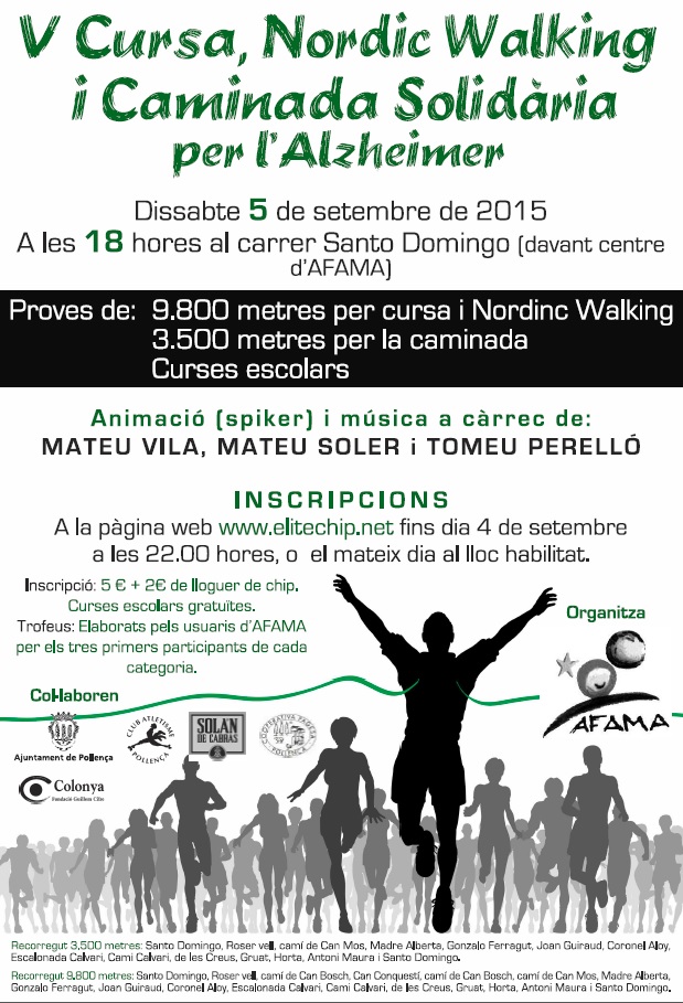 Art.1.  Organització -  AFAMA Pollença “ Associació de Familiars i Amics de Malalts d’Alzheimer” organitzen en col·laboració de   l’Ajuntament de Pollença i Club d’atletisme Pollença una cursa, Nordic Walking i caminada per l’Alzheimer a Pollença el proper dissabte 5 de setembre de 2015 a partir de les 18:00 h.