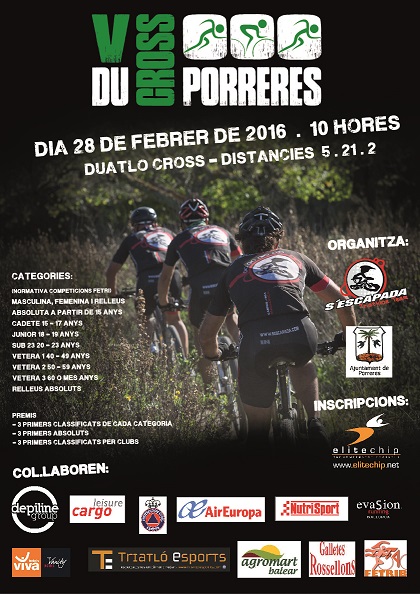 V DUCROSS PORRERES Amb el objectiu de promoure la pràctica de l’esport entre als habitants de Porreres i la de donar a conèixer el municipi de Porreres a tots als veïns dels altres municipis de l’Illa a través de l’esport, L’Ajuntament de Porreres i el Club S’Escapada organitzen un duatló en la modalitat cross  únic i apassionant, un duatló per uns dels millors entorns dels  voltants del municipi de Porreres, on el poble de Porreres a través d’aquesta prova i juntament amb altres, serà un dels municipis més importants en quant a diversitat i promoció de l’esport de les Illes Balears.