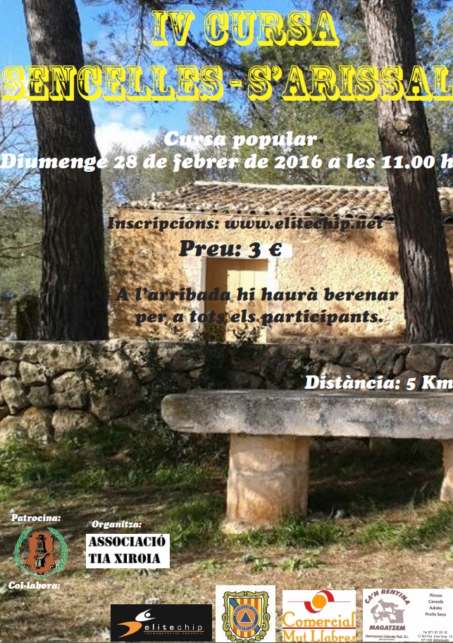 La IV Cursa popular Sencelles – s’Arissal tindrà la sortida oficial dia 28 de febrer de 2016 a les 11’00 h. des de la Plaça de la Vila. El recorregut de la cursa serà d'uns 5 Km aproximadament i la finalització està prevista devers de les 12’00 a la caseta de s’Arissal.