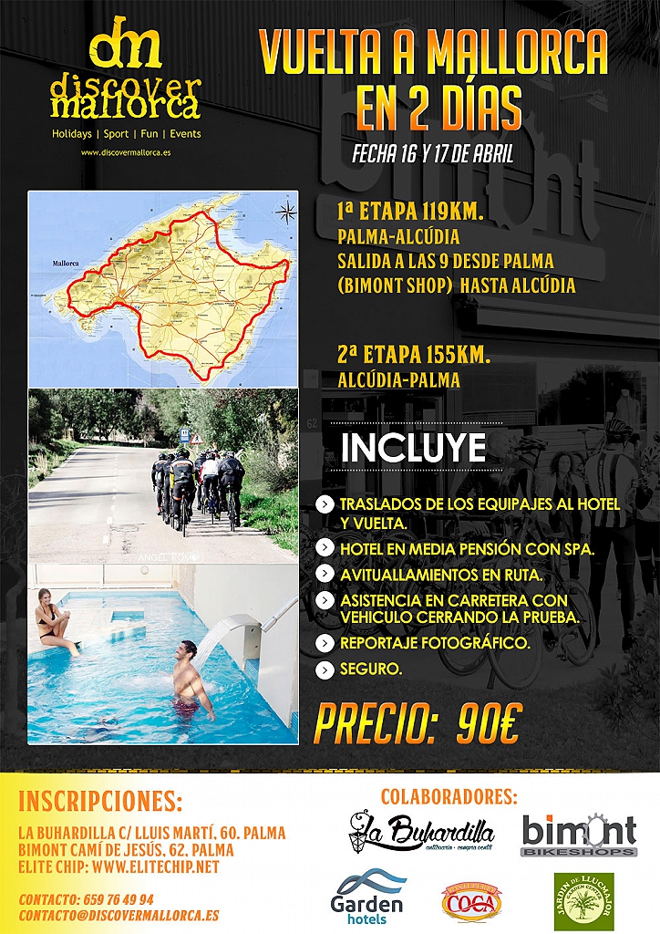 Por segundo año consecutivo y gracias a la gran aceptación de la primera edición volvemos de nuevo con esta bonita prueba. Como novedad para este año es que el recorrido será a la inversa. La 1ª etapa tendrá la salida desde Bimont Bike Shop en Palma recorriendo toda la Sierra para concluir en un precioso hotel 4* en Playas de Muro donde disfrutaremos de su fantástico spa y cena de buffet. La 2ª etapa recorrerá toda la costa sur para finalizar de nuevo en Bimont Shop de Palma para concluir con una picada y un fantástico sorteo.