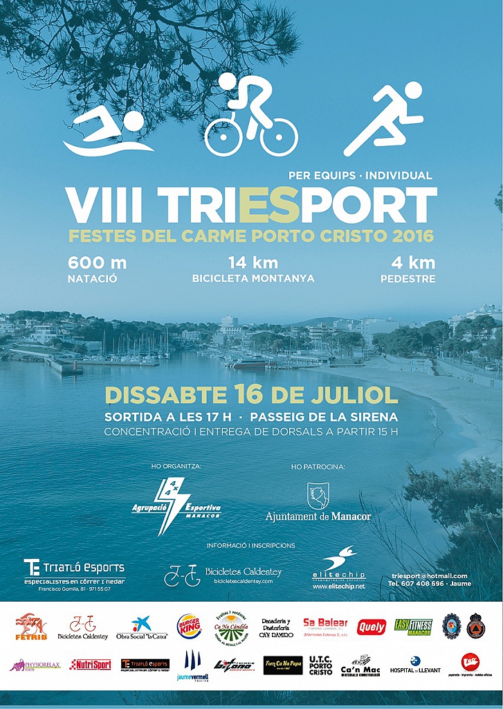 1-La AGRUPACIÓ ESPORTIVA MANACOR tiene previsto organizar el próximo dia 16 de julio 2016,a las 17:00 horas,el "VIII TRIESPORT PORTO CRISTO 2016", prueba que comprende las siguientes modalidades y distancias: