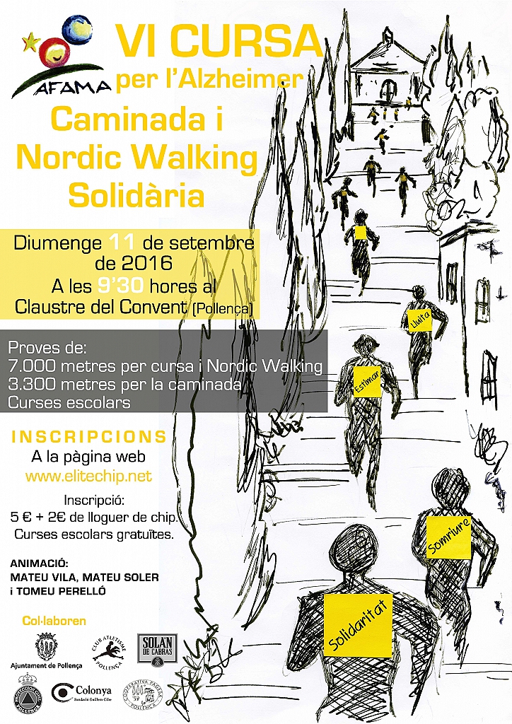 Art.1. Organització - AFAMA Pollença “ Associació de Familiars i Amics de Malalts d’Alzheimer” organitzen en col·laboració de l’Ajuntament de Pollença i Club d’atletisme Pollença una CURSA, Nordic Walking i caminada per l’Alzheimer a Pollença el proper diumenge 11 de setembre de 2016 a partir de les 9:30 h.