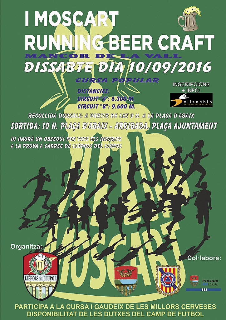 La MOSCART RUNNING BEER és la primera cursa popular que es celebrarà dintra del marc de la Mostra de la Cervesa Artesana " MOSCART" a Mancor de la Vall i a la qual tots els participants i acompanyants hi estau convidats.