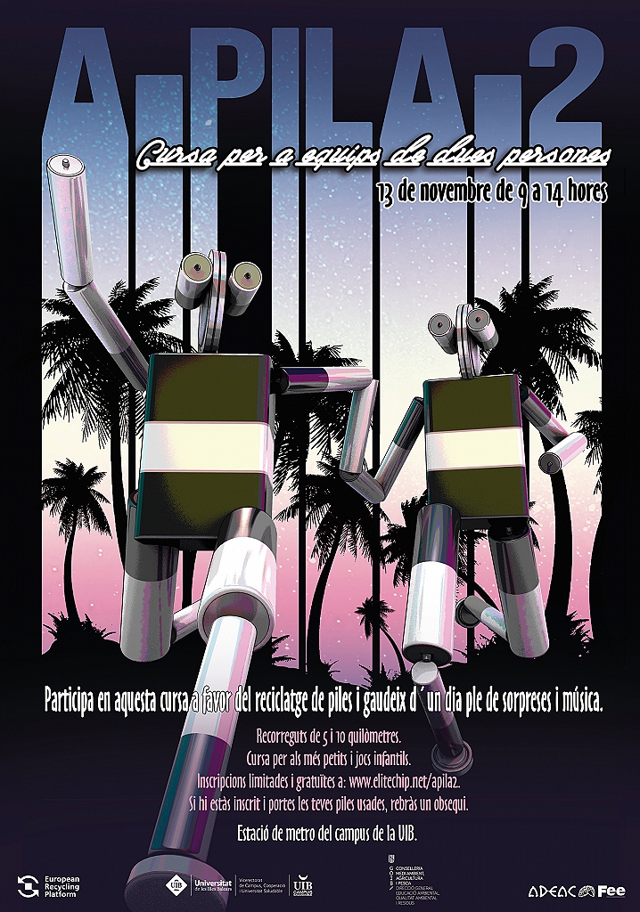 La carrera APILA2 organizada por ERP (European Recycling Platform), Vicerrectorado de Campus, Cooperación y Universidad Saludable de la Universidad de las Illes Balears, ADEAC (Asociación de Educación Ambiental y del Consumidor), y con la colaboración de la Consellería de Medioambiente, Agricultura y Pesca del Govern de les Illes Balears, se llevará a cabo el domingo 13 de noviembre a las 9 h en el Campus de la UIB.