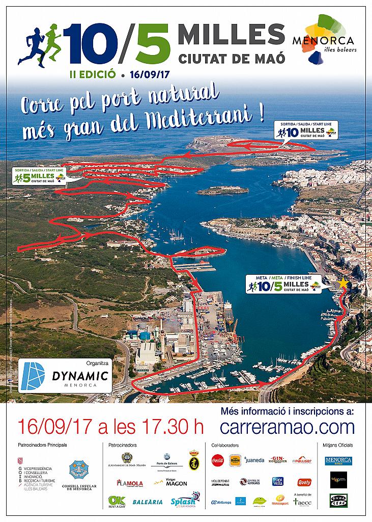 DYNAMIC MENORCA S.L. organises on the 16thSeptember2017, the 2nd“10 MILES and5 MILES CITY OF MAÓ”, which will start at 5.30 p.m. in the Fortress of La Mola (Port de Maó) for the runners of the 10 Miles and at Cala Llonga Urbanization (Passeig dels Mariners street) for the runners of the 5 Miles. There is just one Finishing Line and it will be placed in the Port deMaó (Sea Stations Cruises).