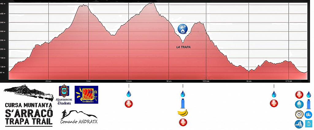 aproximadament al km 7,5 (cases de Ses Basses), al Km 11 el segon amb avituallament sòlid (La Trapa) i al km 16,7 el tercer (cementiri de S'Arracó). No es permetrà treure cap tipus d’aliment fora de la zona d’avituallament.