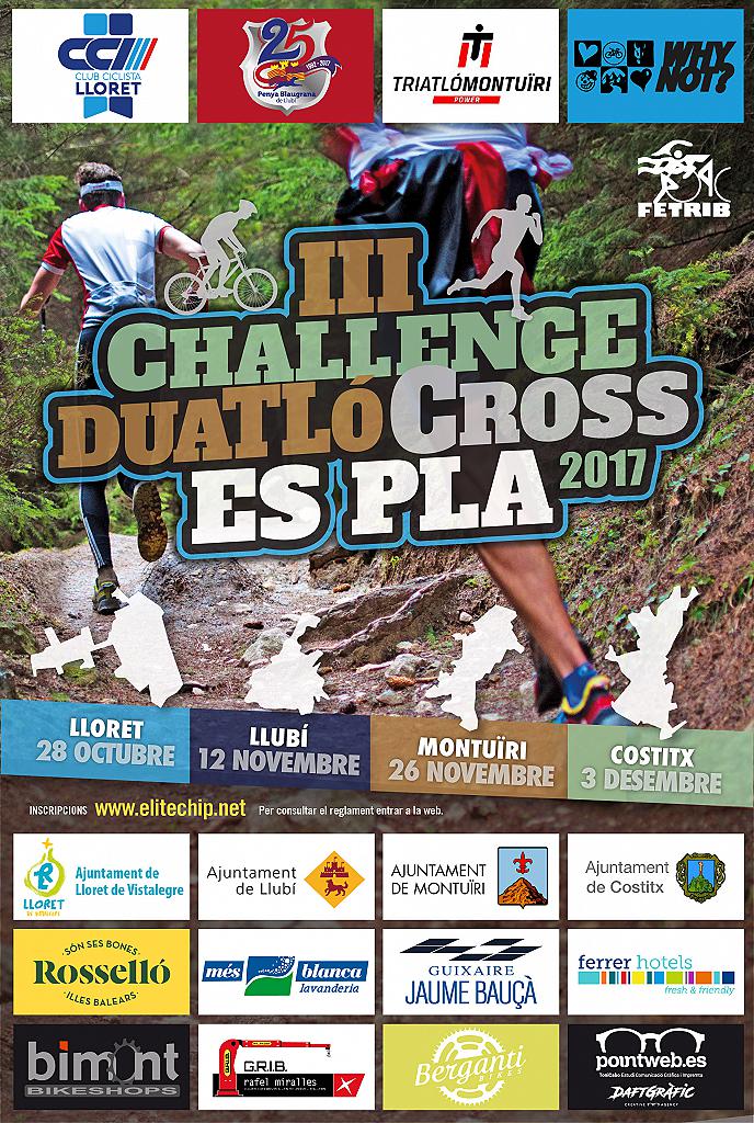 Aquesta CHALLENGE DUATLO CROS ES PLA 2017 es organitzada per: Why not?-Ajuntament de Costitx, Club Ciclista Lloret, Penya blaugrana de Llubí i Club Triatló Montuïri.