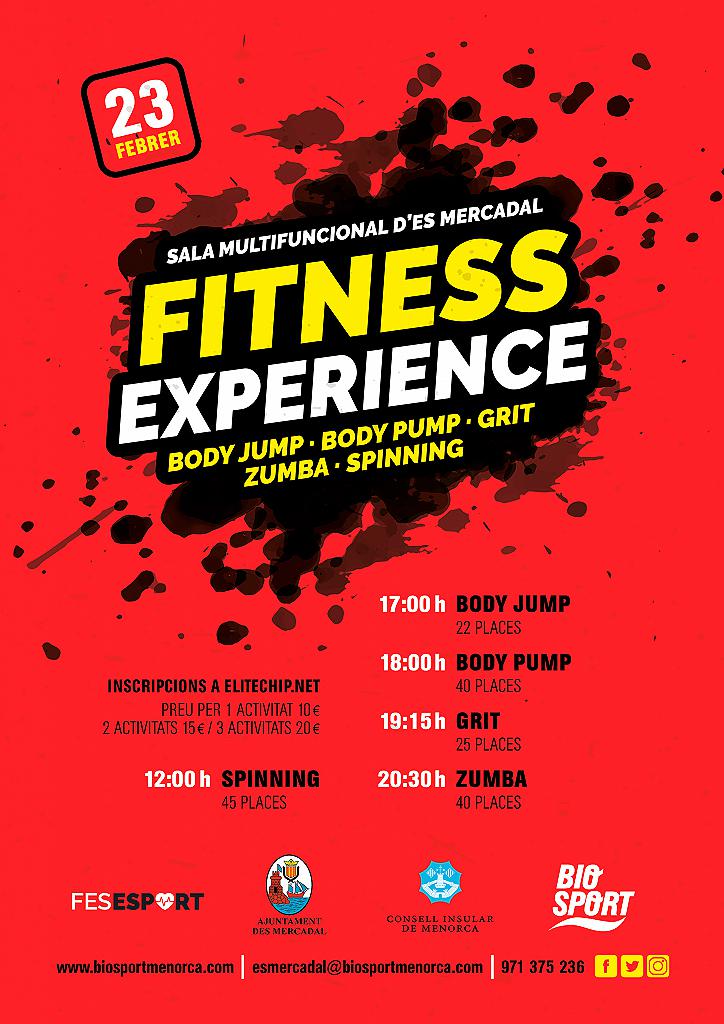 El próximo sábado 23 de febrero de 2019 regresa la tercera edición de la Fitness Experience, un evento organizado por el Ayuntamiento de Es Mercadal y la empresa Biosport Menorca. Se trata de una jornada deportiva diferente con diferentes actividades que tendrán un coste de 10 euros por actividad,  packs de 2 actividades a 15€ y packs de 3 actividades a 20€.