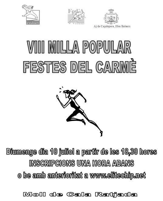 1.- LA MILLA POPULAR FESTES DEL CARME  es celebrarà al moll de Cala Ratjada diumenge dia 10 de juliol a partir de les 18,30 hores amb curses per nins i a les 19 hores la cursa principal, sota l’organització de la Comissió de Festes del Carme, Capdepera en Joc i el Servei Municipal d’Esports de l’Ajuntament de Capdepera. El control tècnic de la prova estarà a càrrec del Comitè provincial de Jutges de la Federació d’Atletisme, amb l’obligació per part dels atletes d’acatar les seves ordres, així com aquelles que venguin de l’organització i dels agents de l’autoritat.